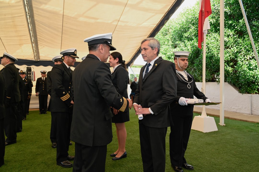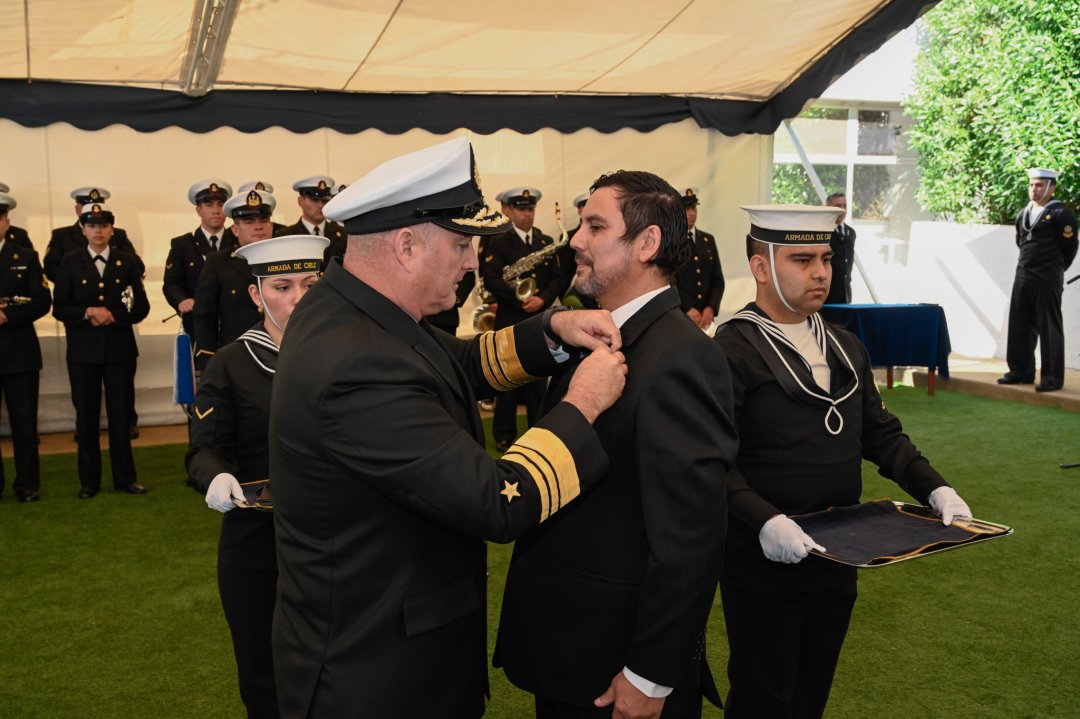 Tras las palabras, se hizo entrega de distintivos y diplomas al personal naval y civil que, de manera comprometida, han aportado con sus conocimientos durante 10 y 20 años de servicio en el SHOA. Personal a contrata SHOA Nanette Arias Vargas y Luis Henríquez Cortés fueron reconocidos por dos décadas en el Servicio.