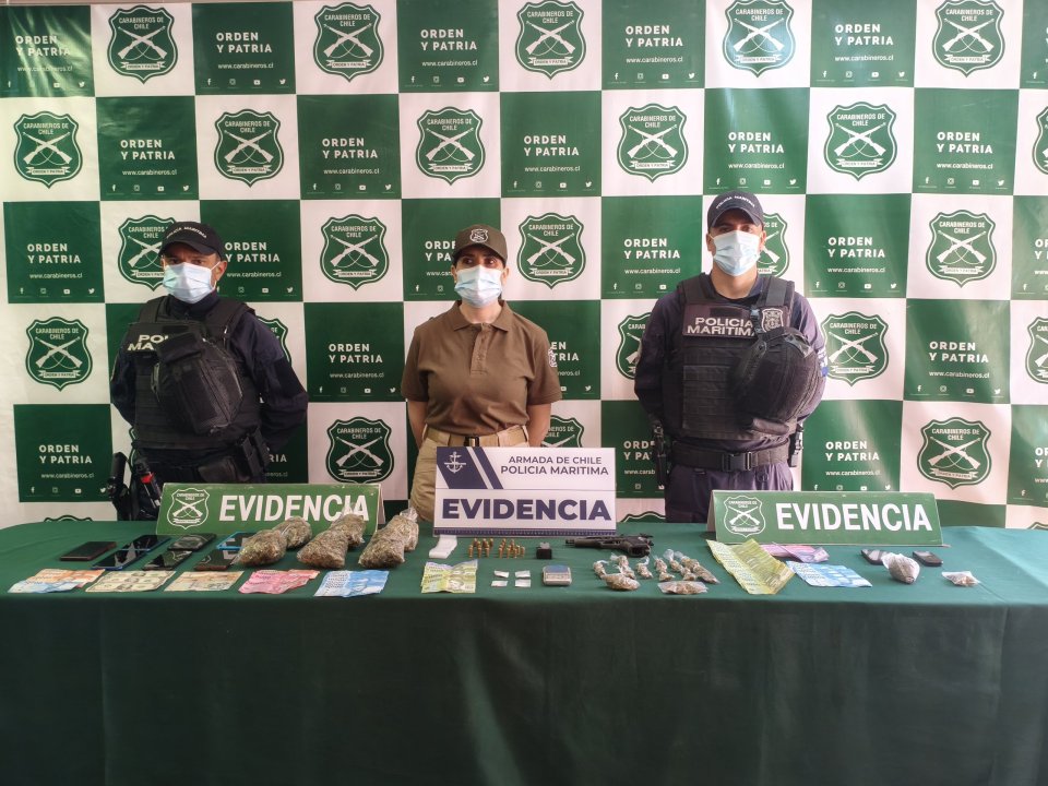 En el procedimiento, llevado a cabo este miércoles 1 de octubre por personal de Policía Marítima y Carabineros de Chile, se materializaron allanamientos simultáneos en dos domicilios en el sector centro de la ciudad, consiguiendo la detención de dos ciudadanos chilenos e incautando un arma de fuego, munición, dinero en efectivo, droga y elementos para su dosificación y posterior comercialización.